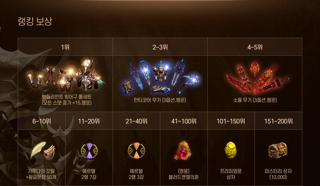 귀족의문장 – 브릴리언트 방어구 풀세트 (모든 스탯 증가 +15, 행운) | 0.0015% |